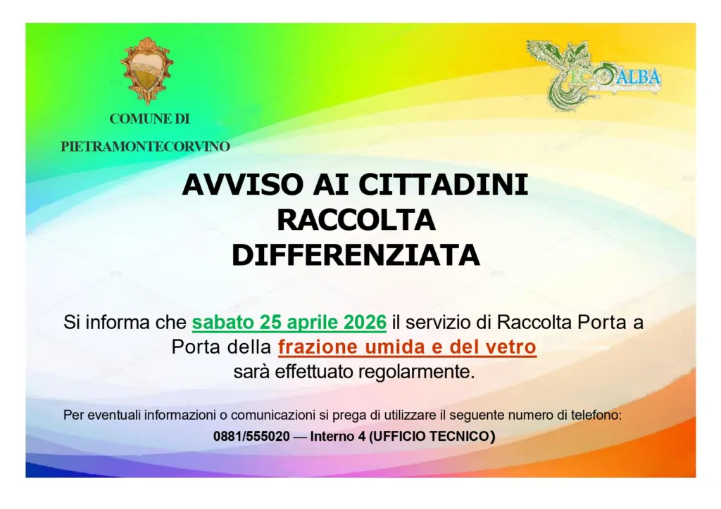 AVVISO RACCOLTA PORTA A PORTA 25 APRILE 2026